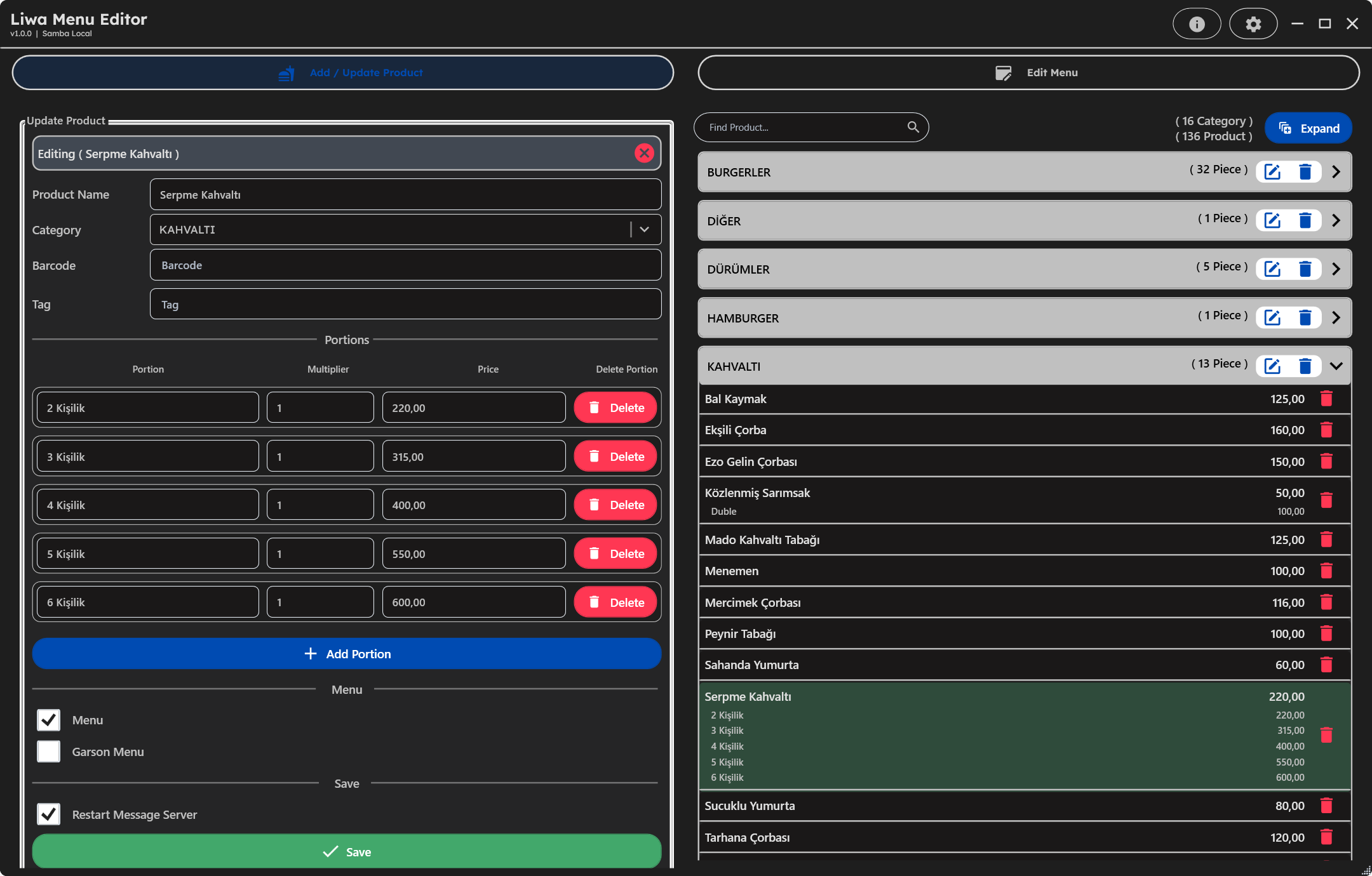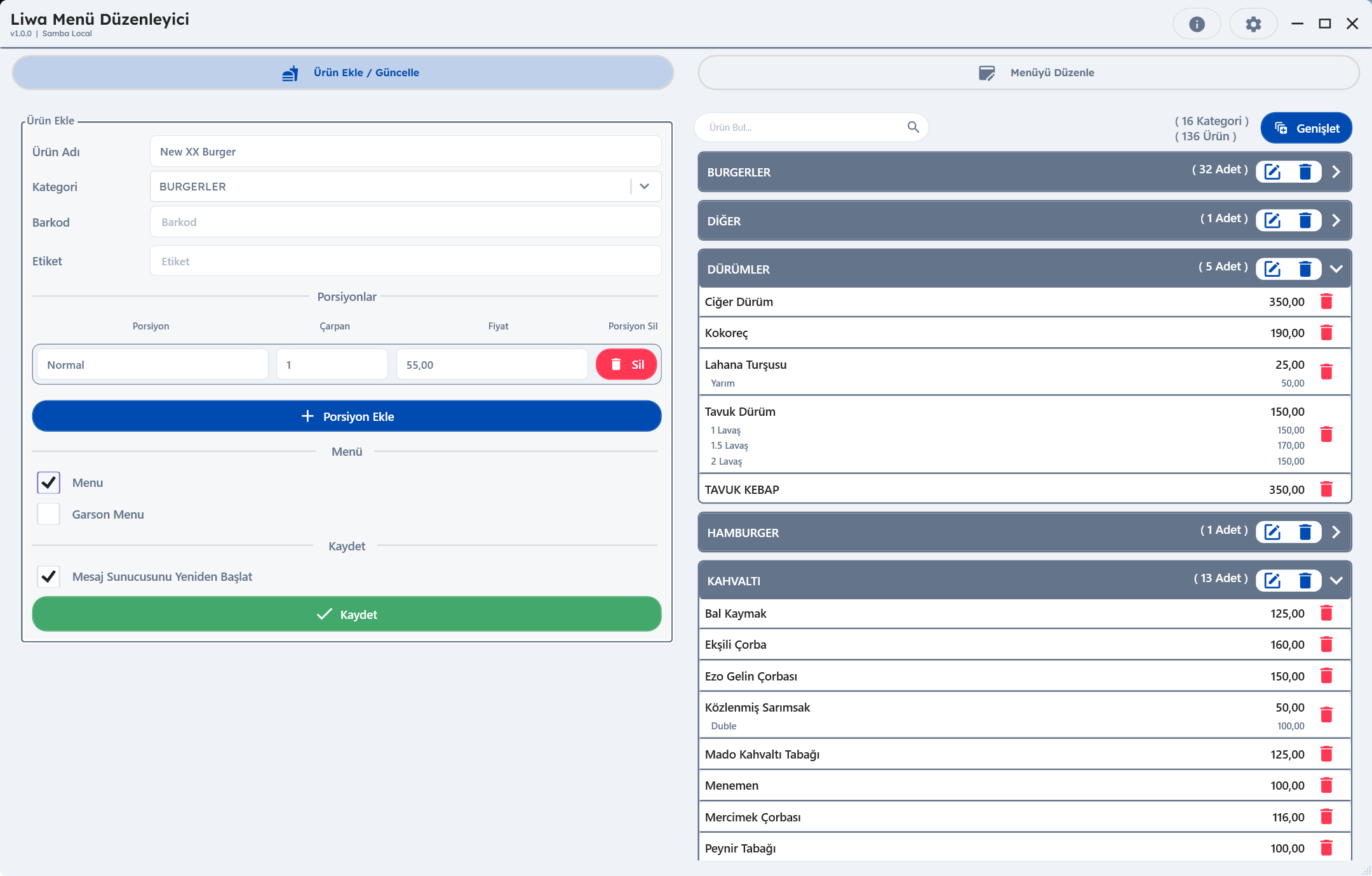 - Yeni bir ürün eklendiğinde artık KATEGORİ seçimi ve en az 1 porsiyon girilmesi zorunludur.